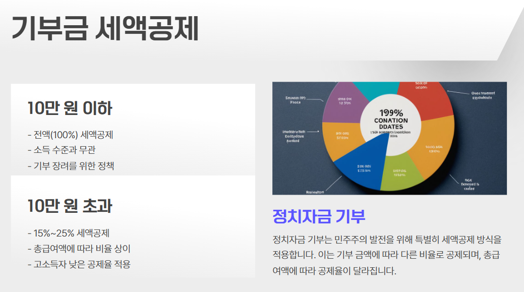 | 정치자금 기부금 | 세액공제 | 10만 원 이하 100%, 초과분은 15~25% |